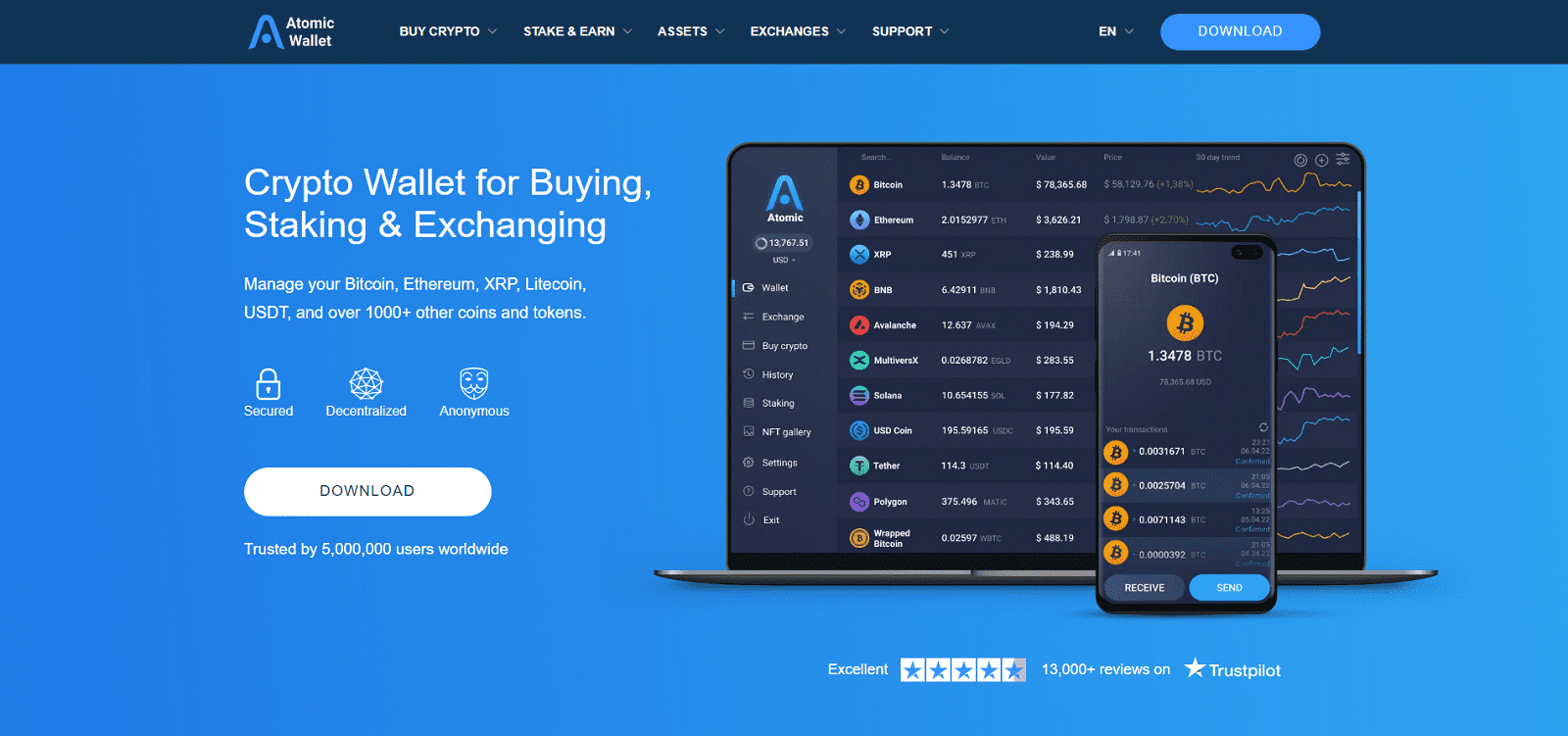 Atomic Wallet is a multi-currency wallet that supports over 500 cryptocurrencies, including Bitcoin (BTC), Ethereum (ETH), and Litecoin (LTC). It allows users to store their assets securely and access them anytime, anywhere. With a focus on security and privacy, Atomic Wallet ensures that users retain full control over their private keys, which are stored locally on their devices rather than on a centralized server.